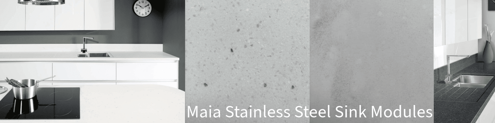 maia® has a range of under-mounted sink modules which are sold as part of a specially fabricated 1.8m or 3.6m worktop with the sink area centrally positioned.