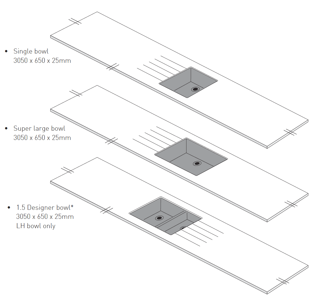 Sink Module Length: = 3050 x 650 x 25mm