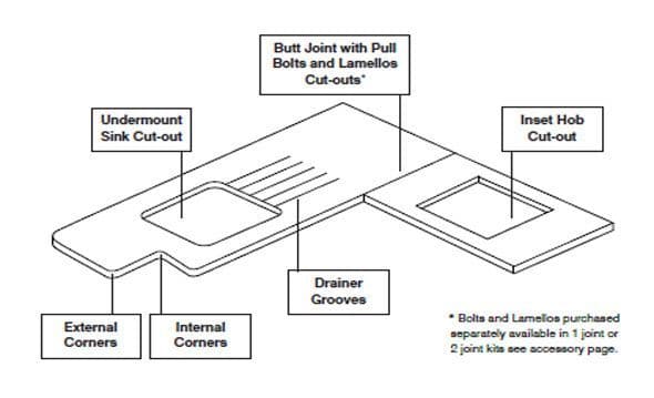 Custom made to order Spectra Slim - Edge surfaces to whatever shape you need. And, you can add features, such as sink and hob cut outs, drainer grooves. Saving you time and money.